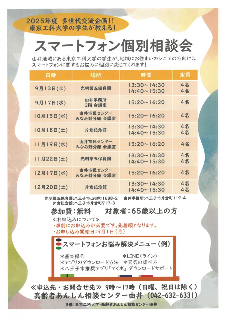 スマートフォン個別相談会が東京工科大学の学生がシニアの方向けにスマートフォンに関するお悩みに個別に応じてくれます。