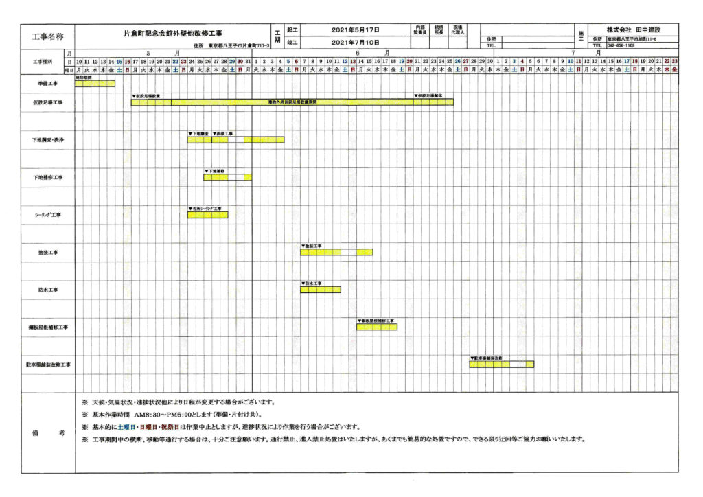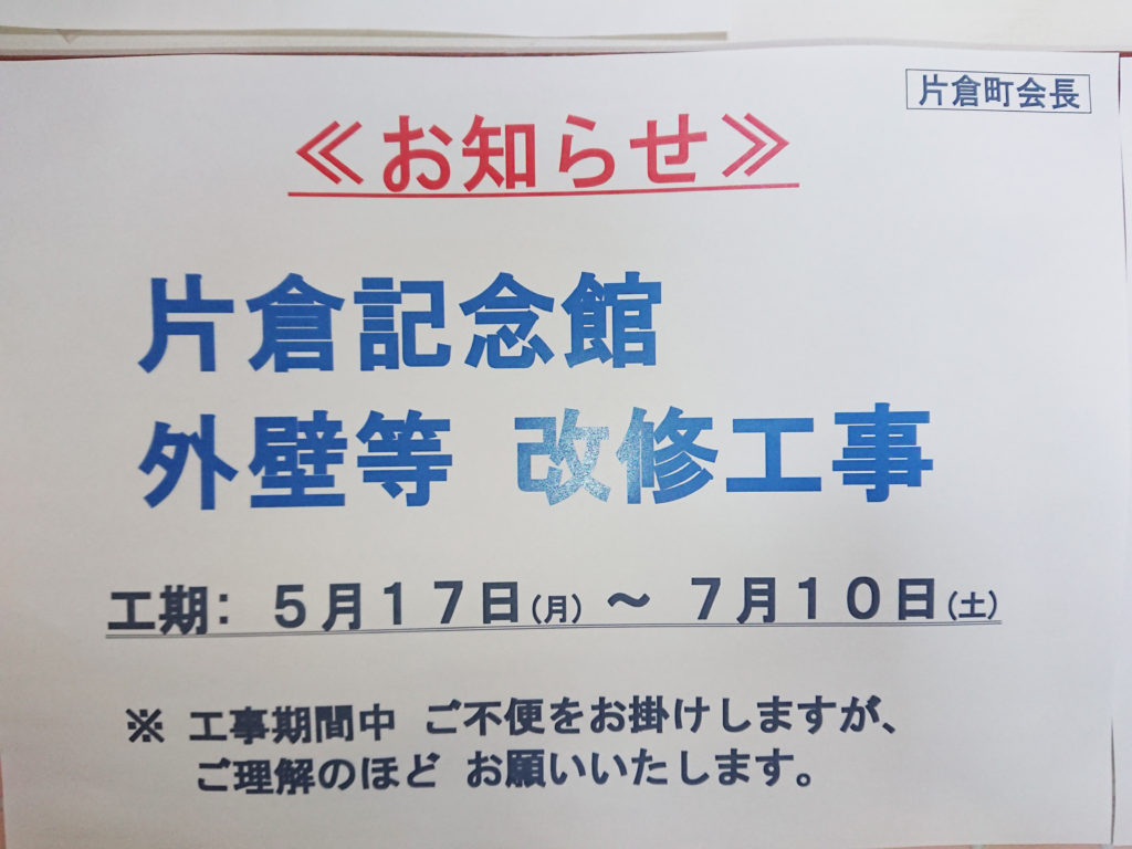 当片倉記念館におきましては、5月17日(月)から7月10日(土)までの間、外壁等の改修工事を行う予定です。基本作業時間は、AM8:30~PM6:00です。土曜日・日曜日・祝祭日は作業中止となりますが、進捗状況により作業が行われる場合がございます。工事期間中の横断、移動等通行する場合は、十分ご注意願います。通行禁止、進入禁止処置はいたしますが、あくまでも簡易的な処置ですので、できる限り迂回等のご協力をお願申しあげます。