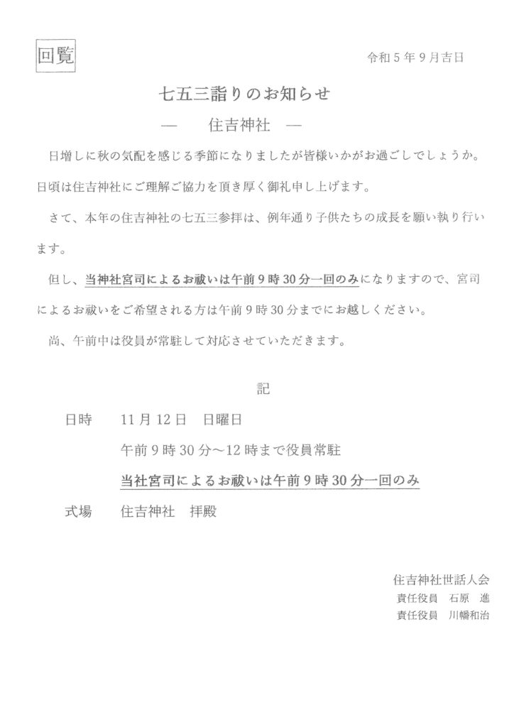片倉城跡公園内の住吉神社の七五三参拝を、令和5年11月12日(日)午前9時30分より、拝殿におきまして子供たちの成長を願い執り行います。