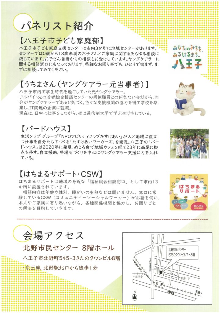 令和7年2月8日(土)北野市民センター8階ホールにおきまして13:30~16:00、平成ノブシコブシの徳井健太氏を講師にお迎えし「気づいてみようとなりのヤングケアラー」講演が行われます。お問合せは八王子市社会福祉協議会 042-649-8477 まで。
