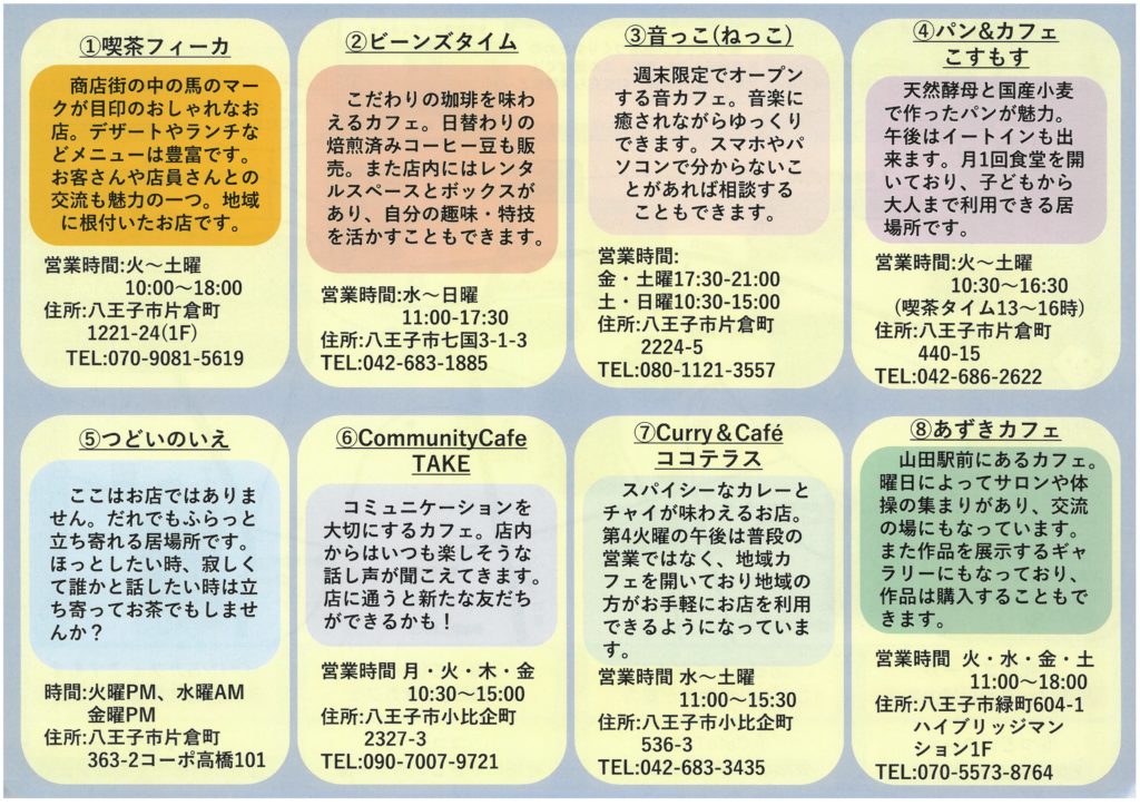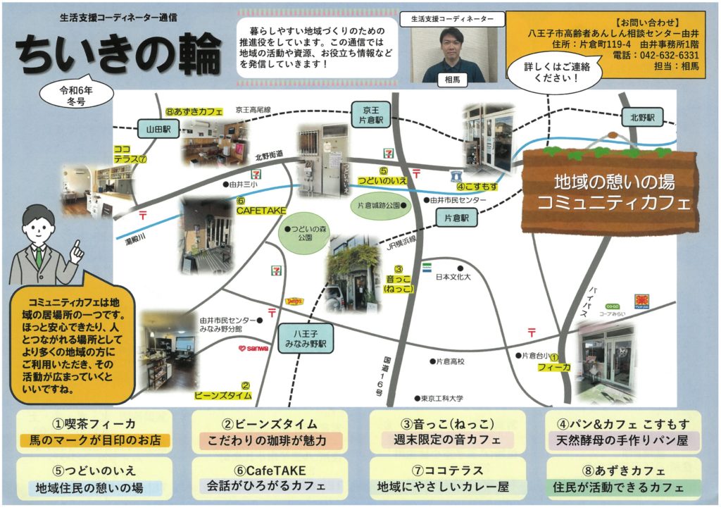 暮らしやすい地域づくりのための推進役をしています。この通信では地域の活動や資源、お役立ち情報などを発信していきます。地域の憩いの場コミュニティカフェをご案内します。