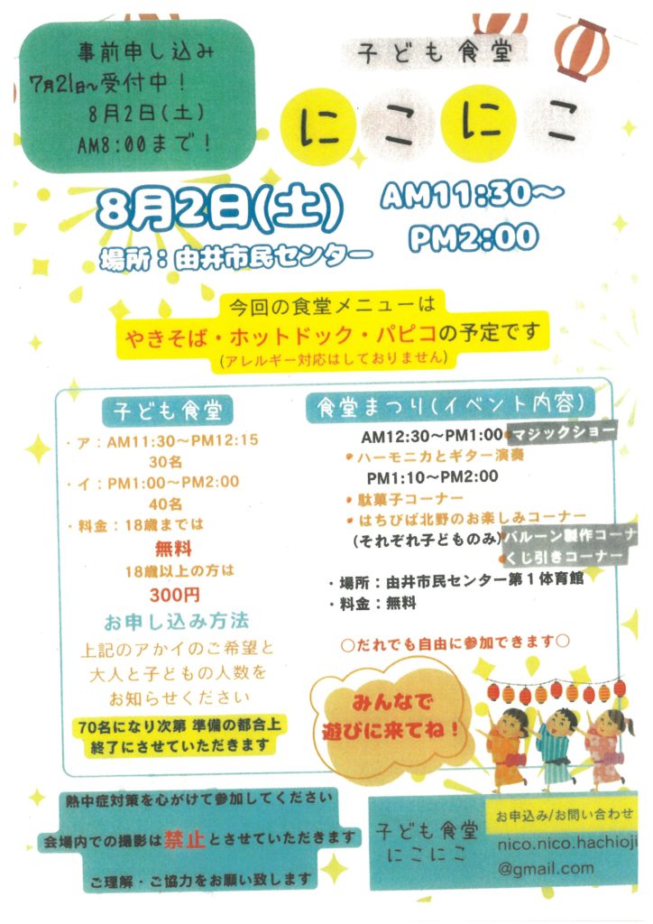 子ども食堂にこにこ 8/2(土)はAM11:30~PM2:00に由井市民センター2階の調理室で開催される予定です。