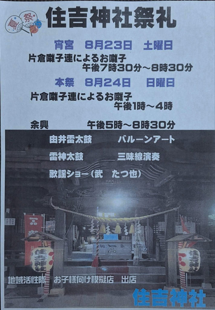 片倉城跡公園内に鎮座されます住吉神社の祭礼が2025年8月23日(土)・24日(日)に行われます。みなさま、どうぞお運びくださいませ。 Share on FacebookPost on XFollow usSave 投稿ナビゲーション 片倉町会 盆踊り大会 2025 お仲間募集!認知症を思う会