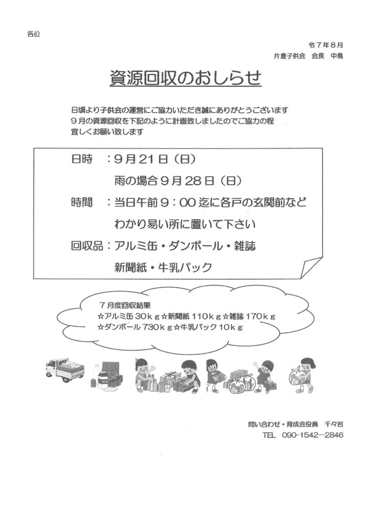 9月21日(日)に資源回収をいたしますので、当日9時までに各戸の玄関前などわかりやすい場所に置いてください。雨の場合は、9月28日(日)に順延です。 Share on FacebookPost on XFollow usSave 投稿ナビゲーション 北野に消防車が戻ってキタノ 片倉城址公園「住吉神社」祭礼 2025