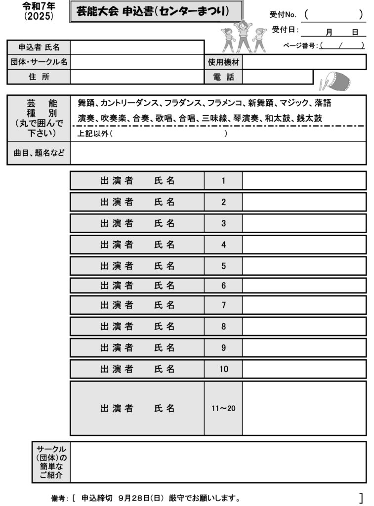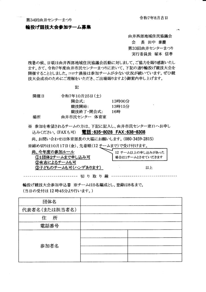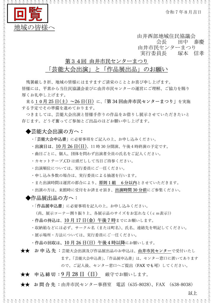 第34回 由井市民センターまつりが2025年10月25日(土)~26日(日)に実施されます。「芸能大会出演」と「作品展出品」のお願い、また、輪投げ競技大会参加チーム募集のご案内です。 Share on FacebookPost on XFollow usSave 投稿ナビゲーション 片倉城址公園「住吉神社」祭礼 2025 無料耐震相談(耐震お助け隊派遣申請書)