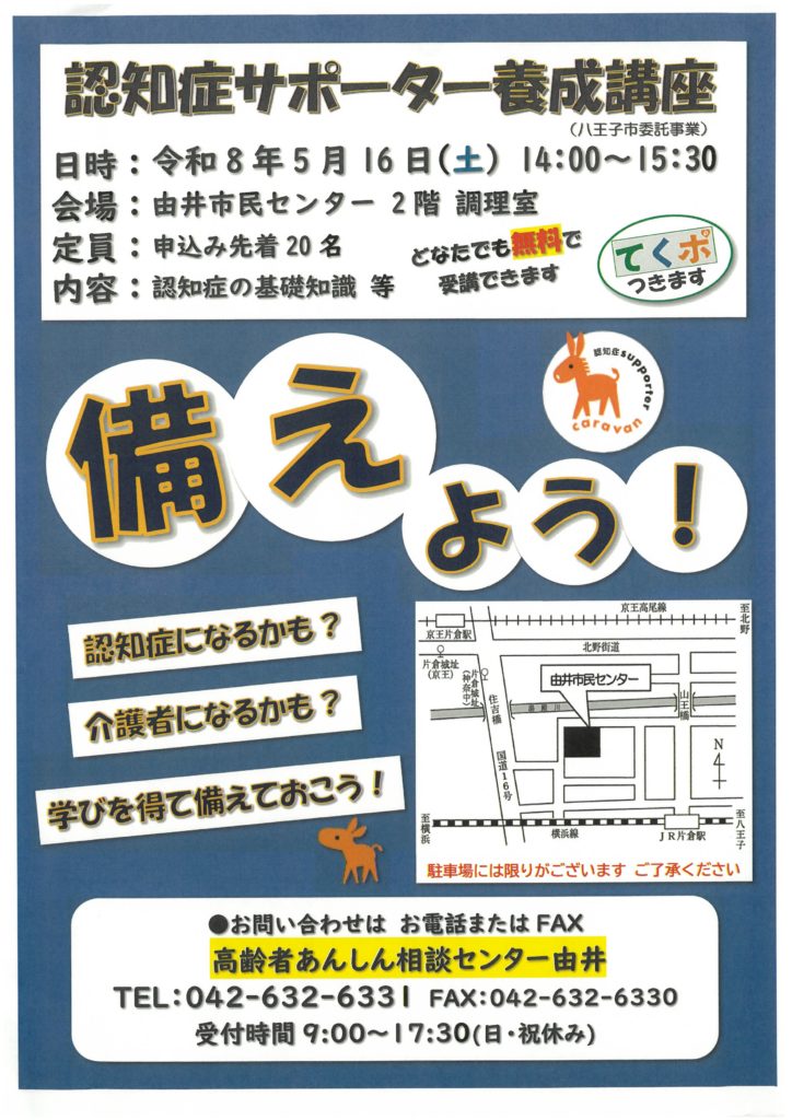 令和8年5月16日(土)14:00~15:30由井市民センター2階調理室におきまして、「認知症サポーター養成講座」が開催されます。申込み先着20名でどなたでも無料で受講できます。 投稿ナビゲーション 健康フェスタ・食育フェスタ 2026